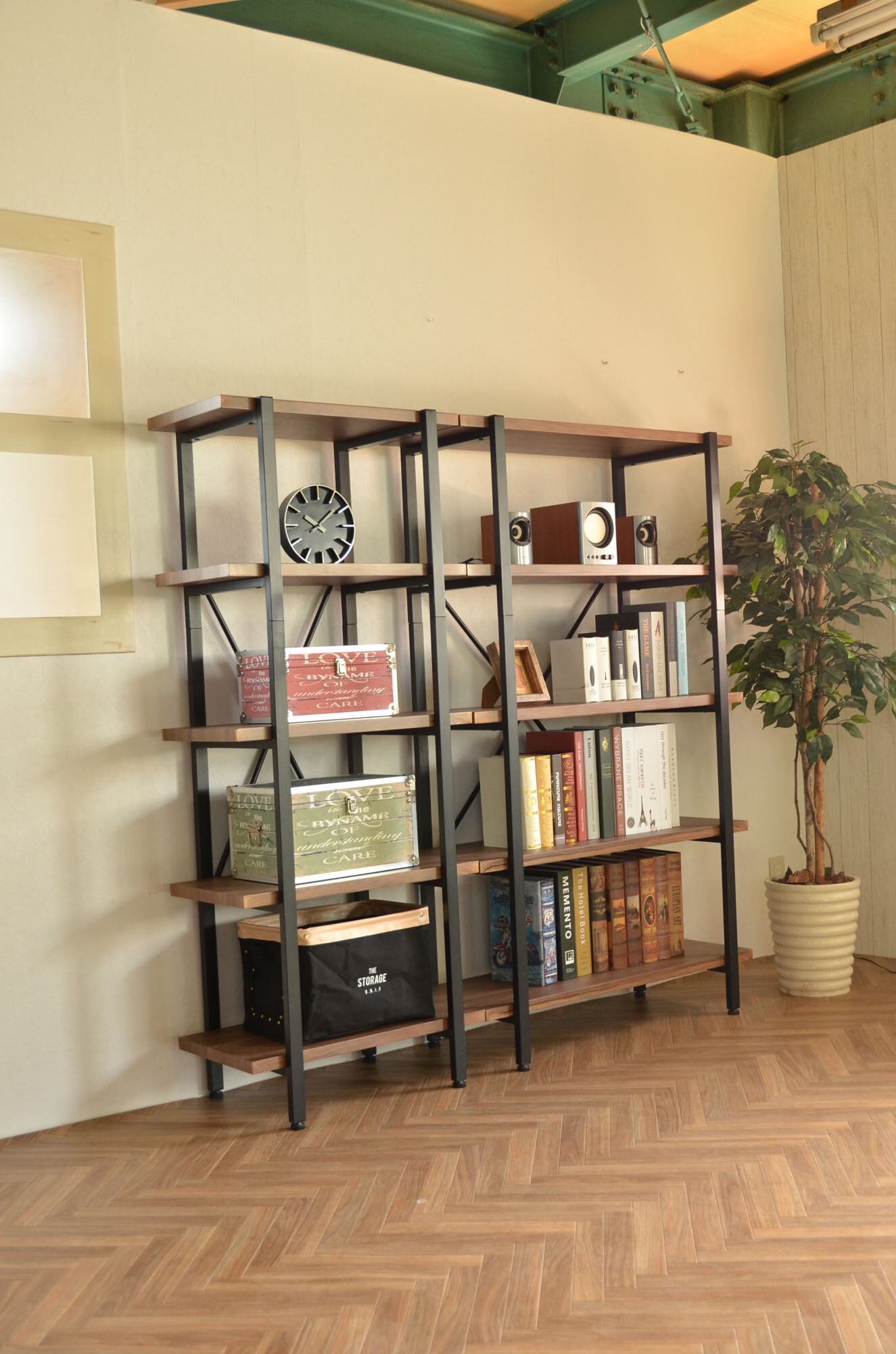 ヴィンテージ風の木目シートとアイアンの組み合わせが絶妙です。7種類のオープンラックのラインナップがあり、2段・3段・4段5段と並べて壁面収納としてご使用頂けると階段のようになり、はやりのキャットウォークも兼ね備えたような壁面収納になります。