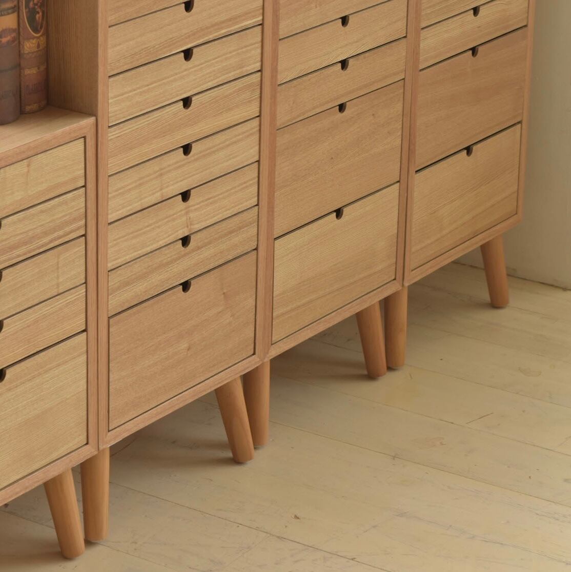 素 材:【本体/引出】中質繊維板にタモの突板貼り(ラッカー塗装)、【脚】パインの天然木(ラッカー塗装)